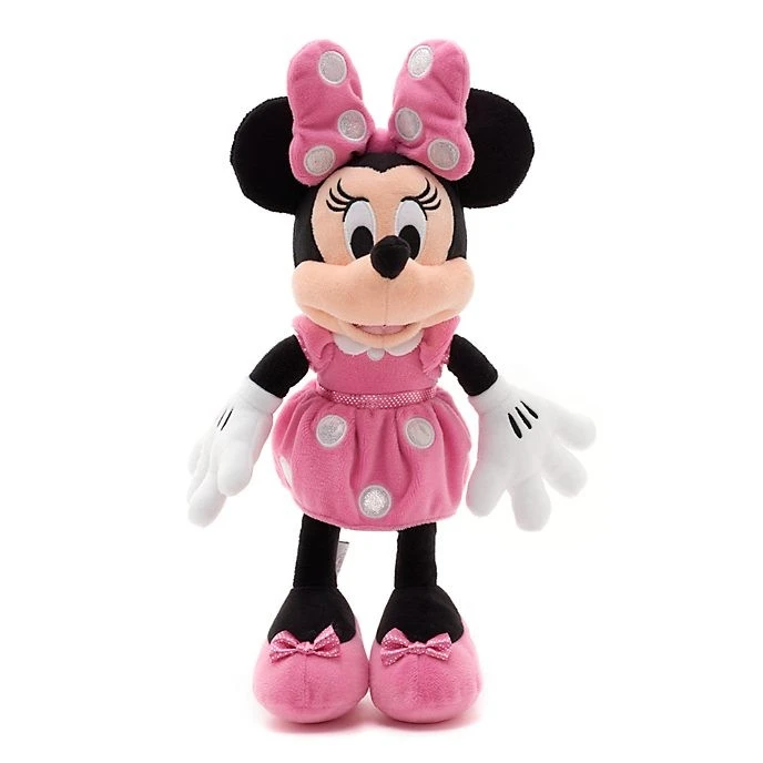La robe à pois classique de Minnie Mouse dans sa version rose ! Cette peluche mesure 33 cm des chaussures au noeud, et arbore une jolie robe à pois, de charmants détails brodés et un ventre mou rempli de billes de polystyrène.