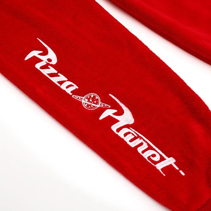 - Inscription “Pizza Planet” brodée le long d’une jambe